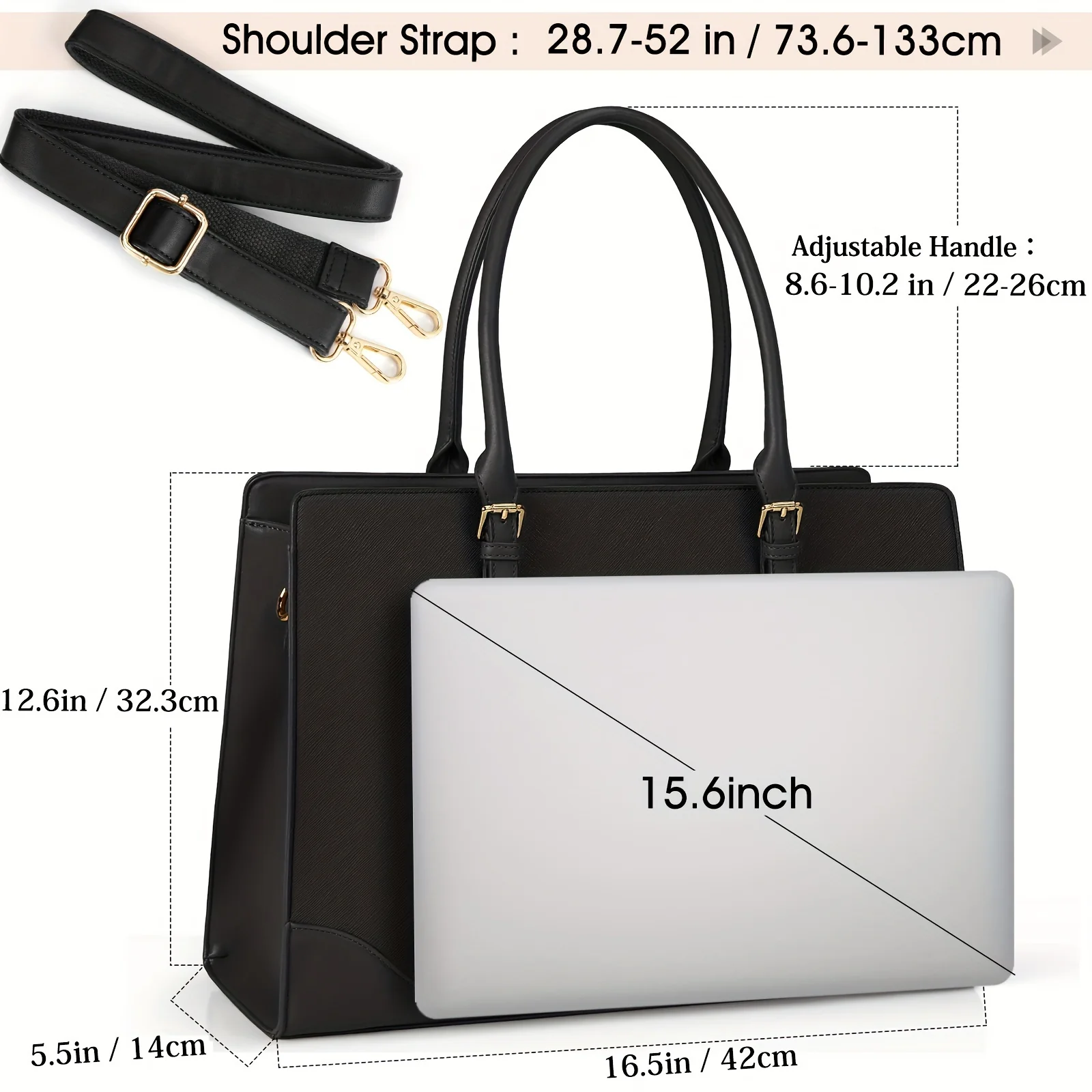 This stylish laptop bag is perfect for women who need a spacious work bag. Made of waterproof PU leather, it features a lightweight design, multiple compartments, and a fashionable shoulder strap.